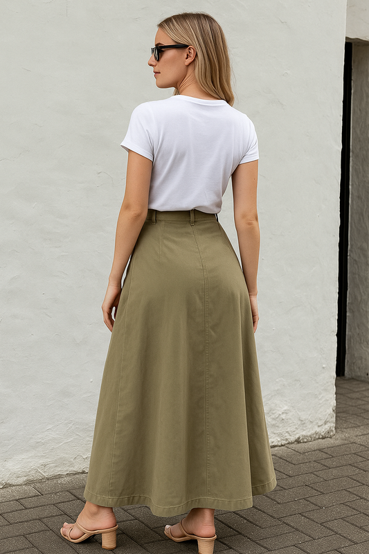 High-Waisted Midi Skirt with Solid Colors and Functional Pockets for Women with Button Front Slit