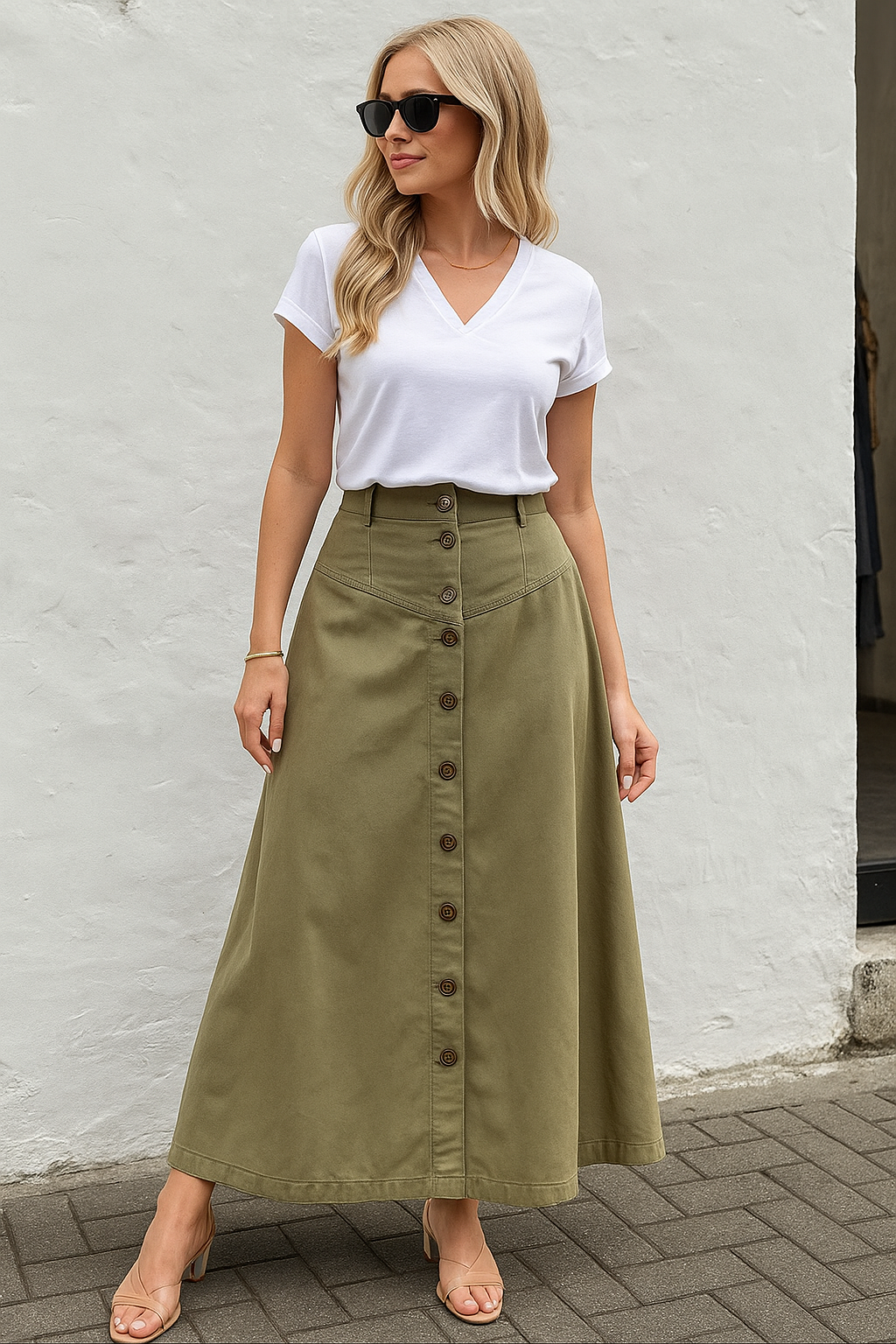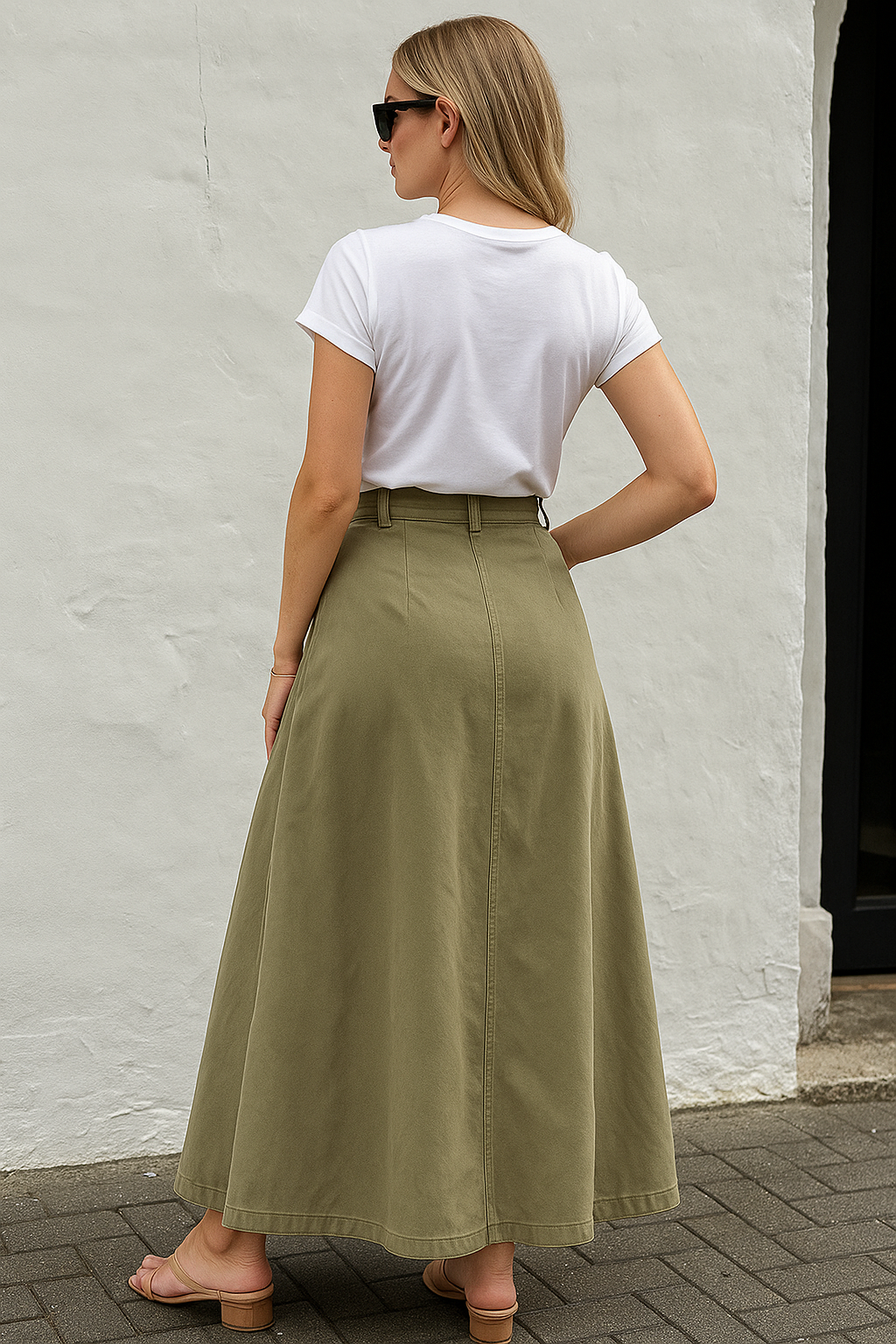 High-Waisted Midi Skirt with Solid Colors and Functional Pockets for Women with Button Front Slit