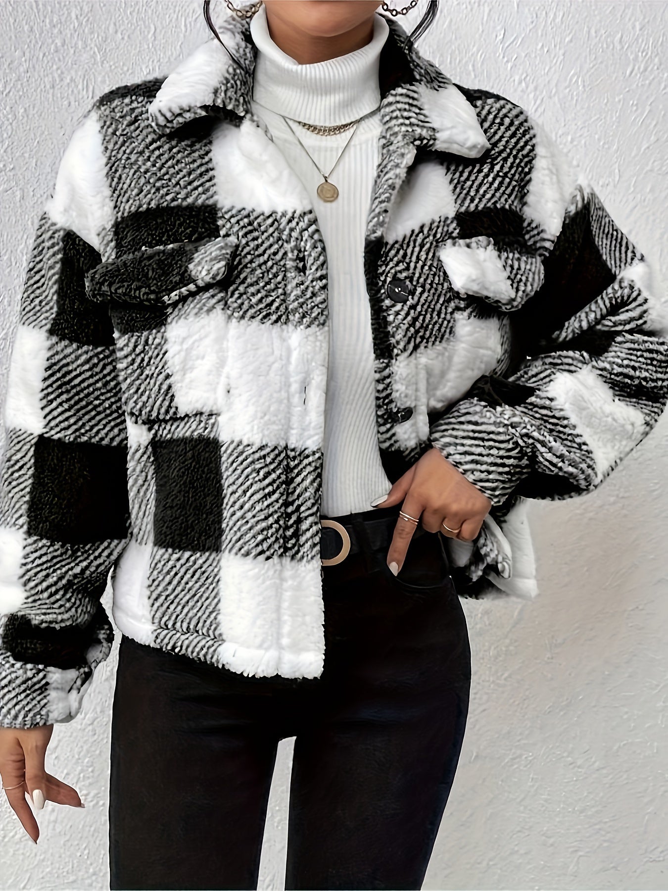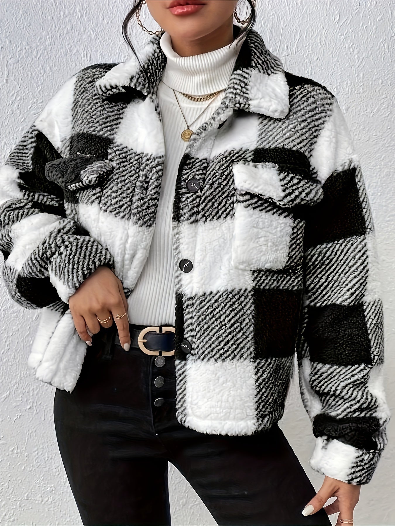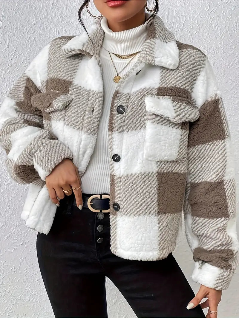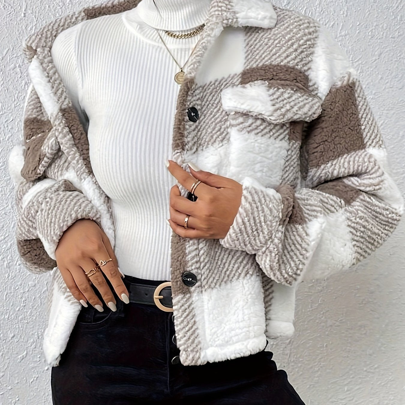 Plaid Button-Up Teddy Coat with Flap Pockets