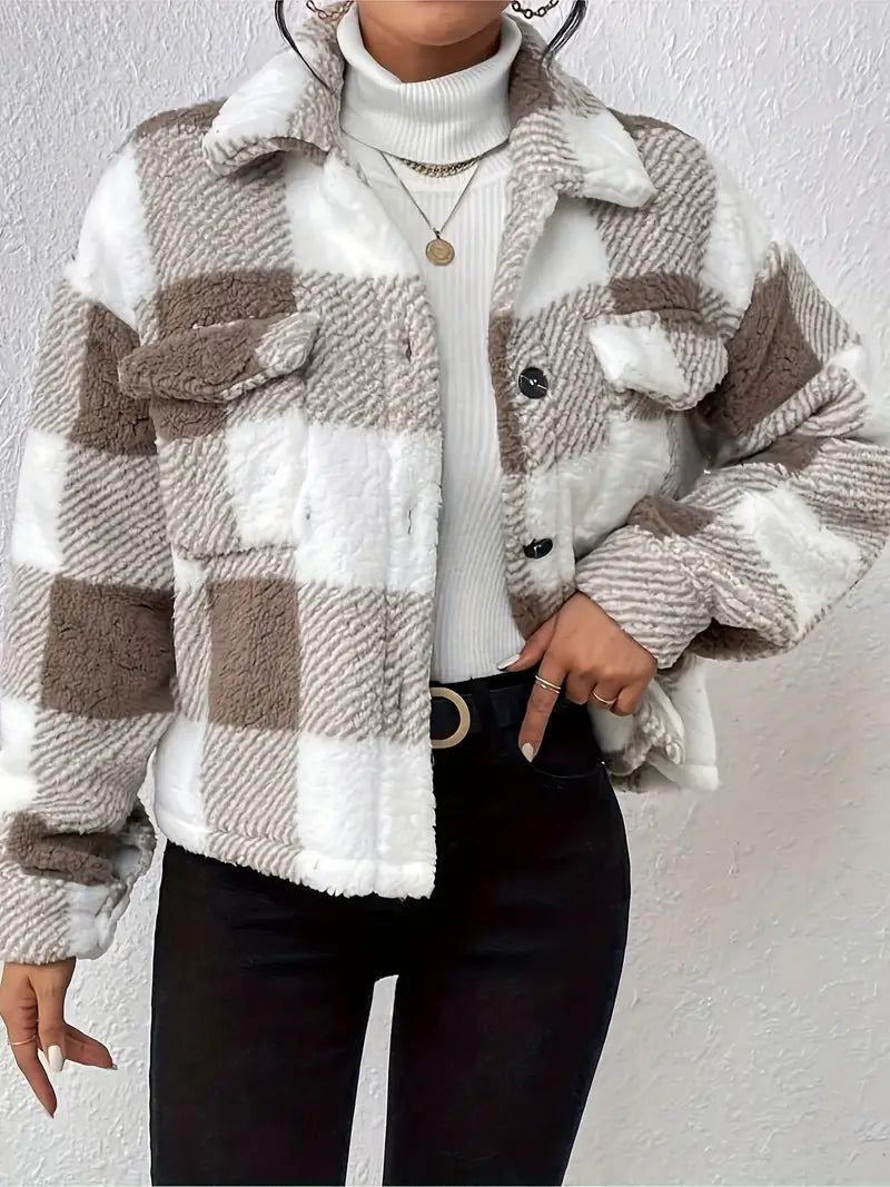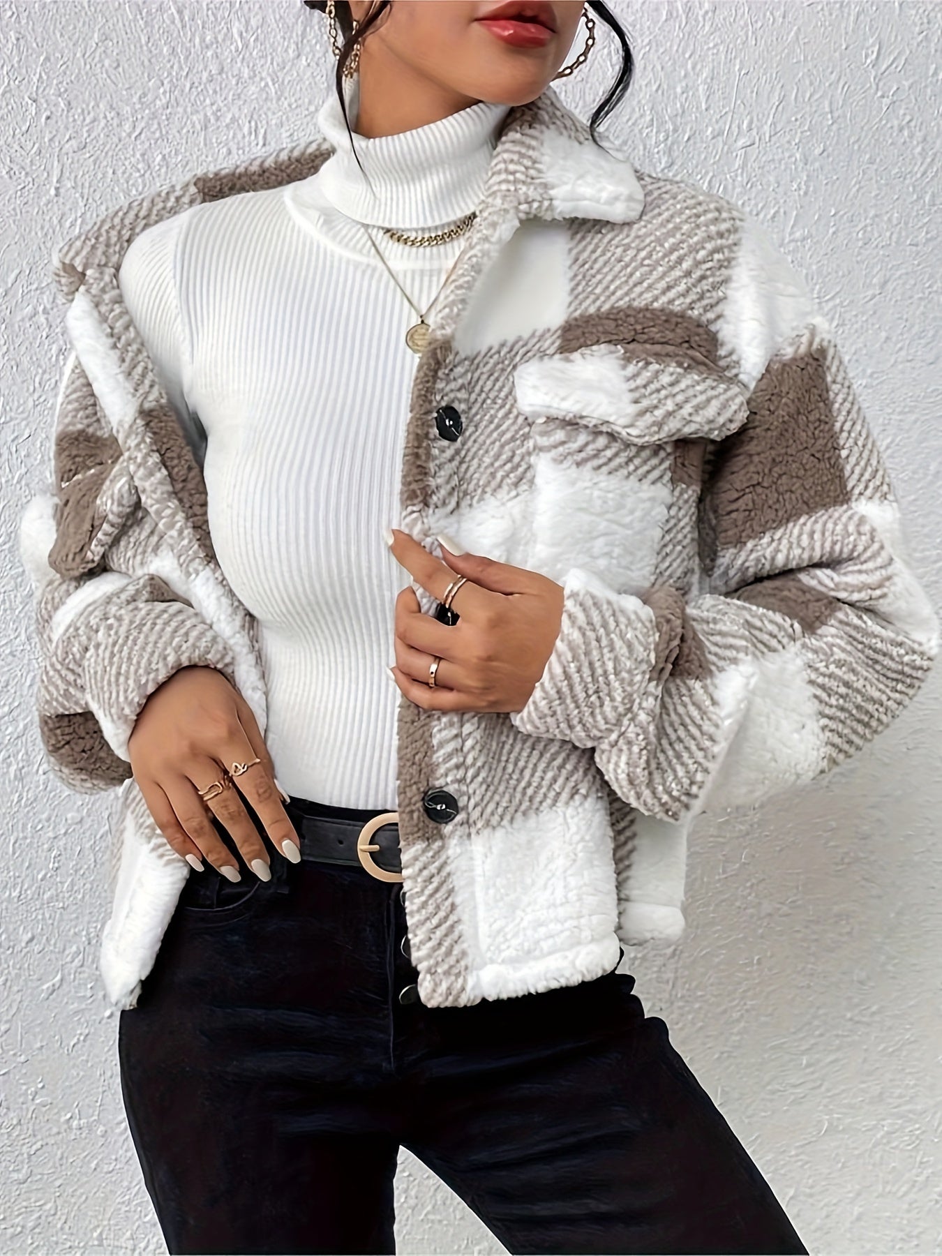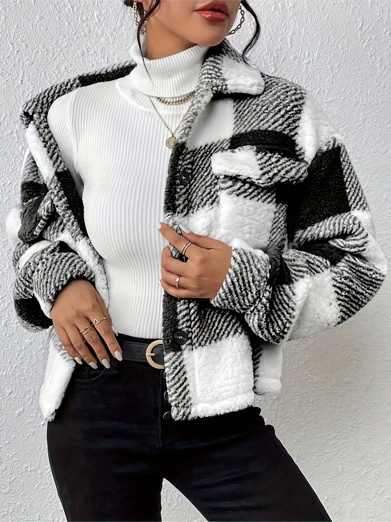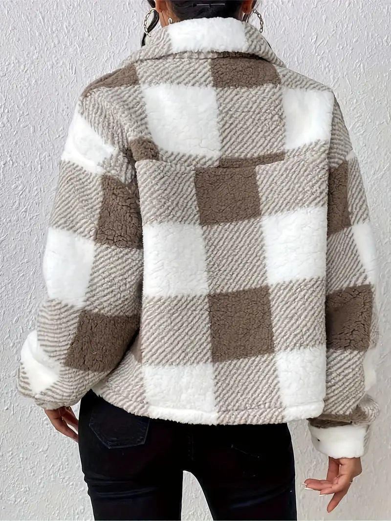Plaid Button-Up Teddy Coat with Flap Pockets