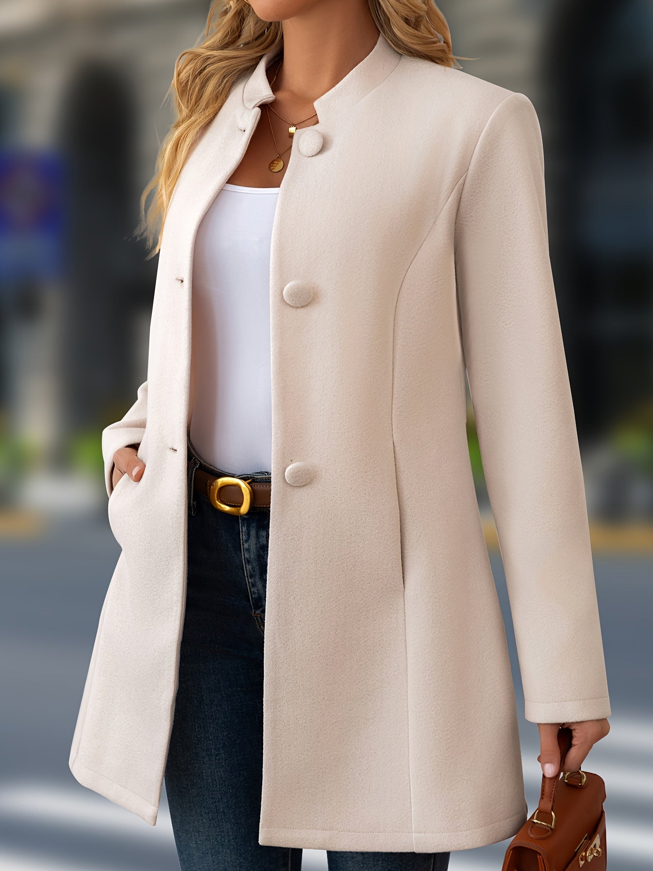 Women's Casual Mid-Length Polyester Jacket with Stand Collar and Button Details